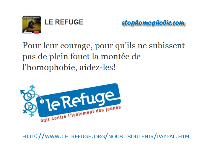 Pour leur courage, pour qu’ils ne subissent pas de plein fouet la montée de l’homophobie, aidez-les! http://www.le-refuge.org/nous_soutenir/paypal.htm