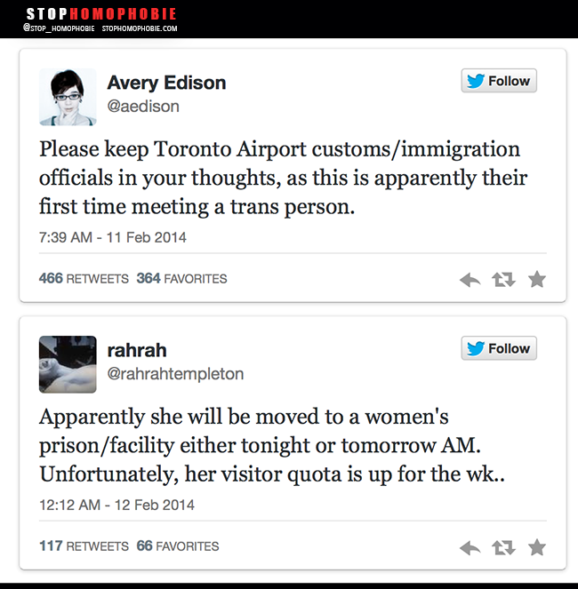 >> Transgender woman Avery Edison to fly home after stay in Ontario jails Avery Edison, 25 ans, affirme avoir été arrêtée à l’aéroport international de Toronto...