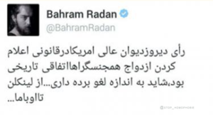 Le même jour Bahram Radan effaçait son message. Mais cela n’a pas empêché les autorités de l’interroger. Et, vingt quatre heures plus tard, le journal publiait une lettre dans lequel il demandait pardon, affirmant que l’homosexualité était « inacceptable, immorale et non-islamique ».