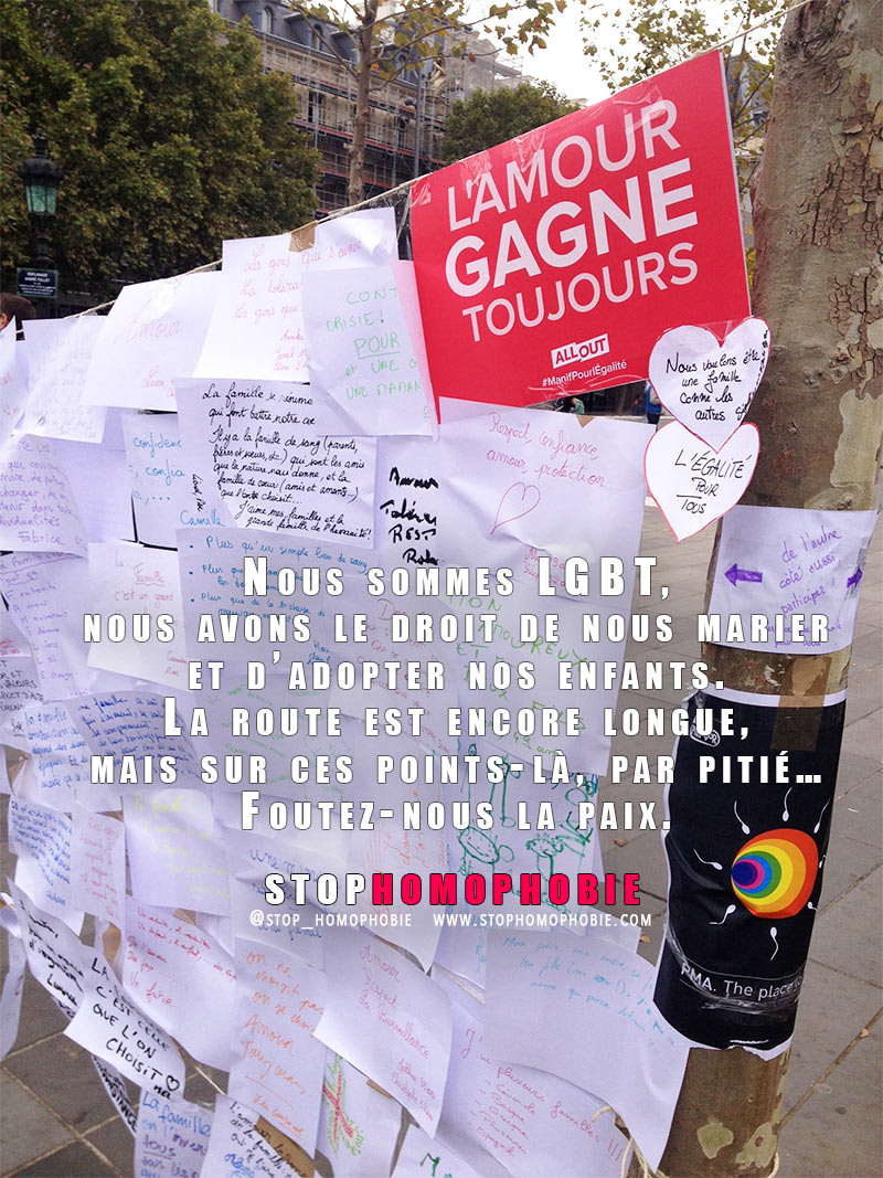 Nous sommes LGBT, nous avons le droit de nous marier et d’adopter nos enfants. La route est encore longue, mais sur ces points-là, par pitié… Foutez-nous la paix. Et si vous tenez tant que ça à vous exprimer sur ces questions, réfléchissez posément à la façon dont vous allez le faire, en particulier si vous n’êtes pas concerné•e•s.