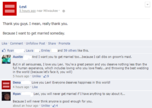 Levi A. Miles est étudiant à l’Université du Wisconsin dans le Milwaukee. En mars dernier, avec toute l’agitation autour de la décision prochaine de la Cour Suprême d’étendre le droit au mariage de même sexe dans tous les États-Unis, le jeune homme a décidé dans un acte militant, d’apporter sa contribution. Il a partagé un message sur son compte, en déclarant qu’il était homosexuel et souhaitait un jour pouvoir se marier.