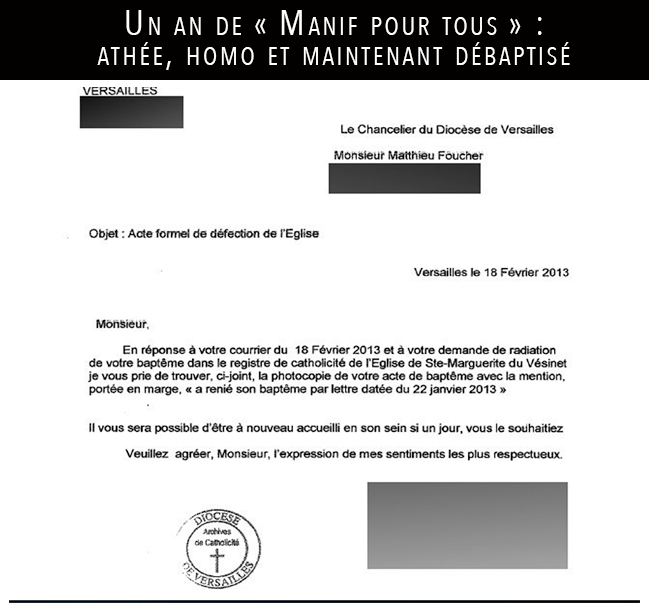 En janvier, je franchis le pas. J’écris à l’évêché de Versailles pour demander à ce qu’on mon nom soit rayé, mais laissé visible, des registres de l’Eglise, qu’y soit inscrite la mention suivante :