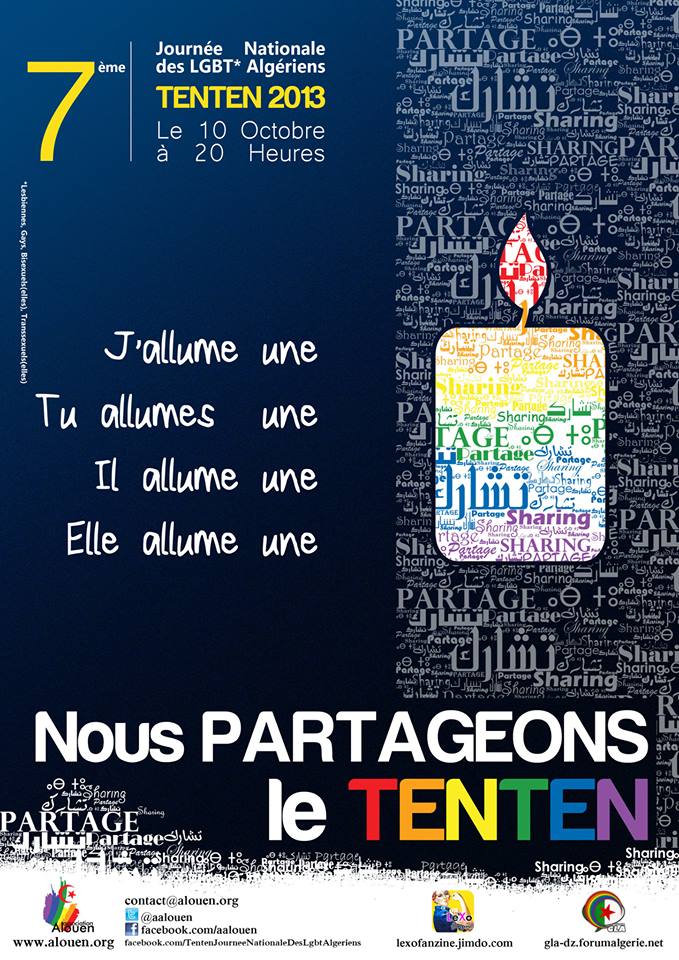 Le TenTen c’est allumer une bougie le 10 Octobre à 20h00 en signe d’union, de mobilisation et d’affirmation mais aussi de solidarité et de soutien à la lutte LGBT en Algérie. Les photos des bougies allumées sont postées et partagées sur Facebook sur notre page TenTen dont le lien figure à la fin de ce mail.
