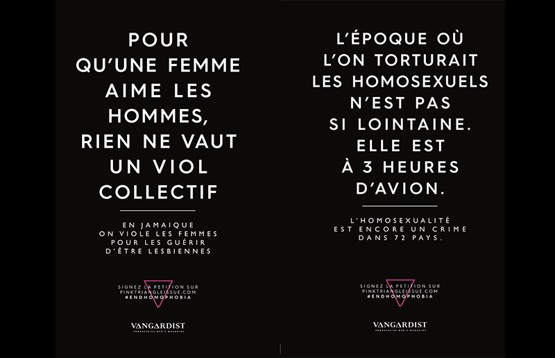 Sur l’une des affiches, on peut lire « Pour qu’une femme aime les hommes, rien ne vaut un viol collectif » et de préciser « En Jamaïque on viole les femmes pour les guérir d’être lesbienne », puis, en petits caractères, un lien vers une pétition ayant vocation à ce que l’ONU inscrive les personnes LGBTQI+ à la Déclaration Universelle des Droits de l’Homme (que nous vous invitons néanmoins à signer : https://pinktriangleissue.com).
