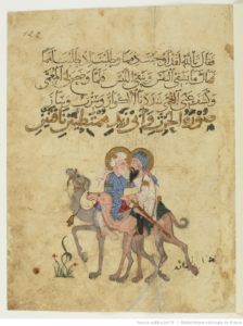 Sur cette enluminure peinte par Yahya ibn Mahmud al-Wasiti en 1237 à Bagdad, les deux personnages, Al-Hârith (le narrateur) et Abû Zayd (le héros), auréolés de leur amour, traversent ensemble le monde arabe médiéval au gré de leurs (més)aventures.