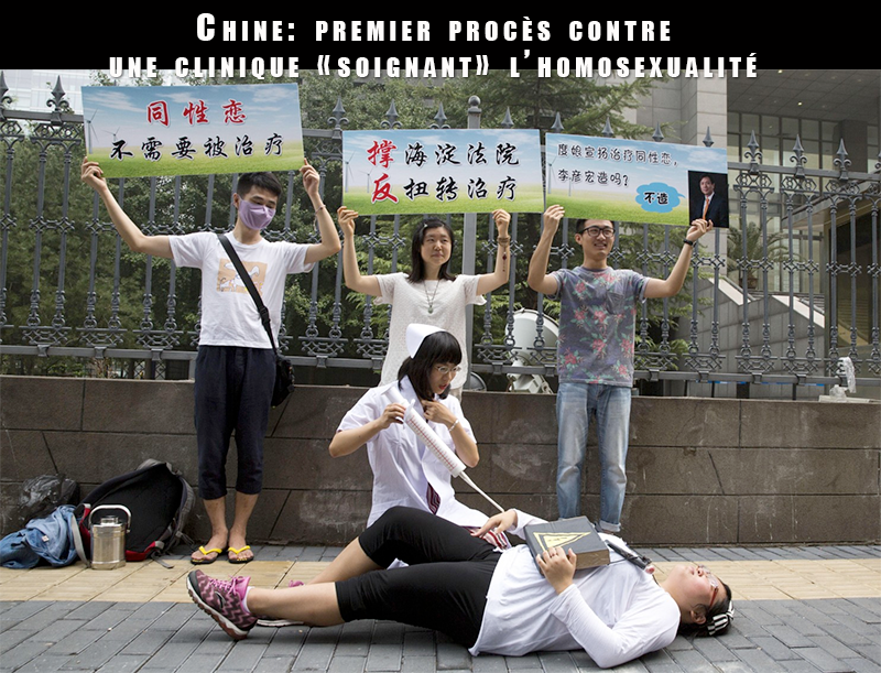 Devant un tribunal du quartier de Haidian, dans l’ouest de la capitale chinoise, une activiste déguisée en infirmière brandit une grande aiguille factice qu’elle fait mine d’injecter de force à un faux patient. « L’homosexualité n’a pas besoin d’être soignée! Que le tribunal de Haidian s’oppose aux thérapies de réorientation! », scandent autour d’elle une dizaine de militants.