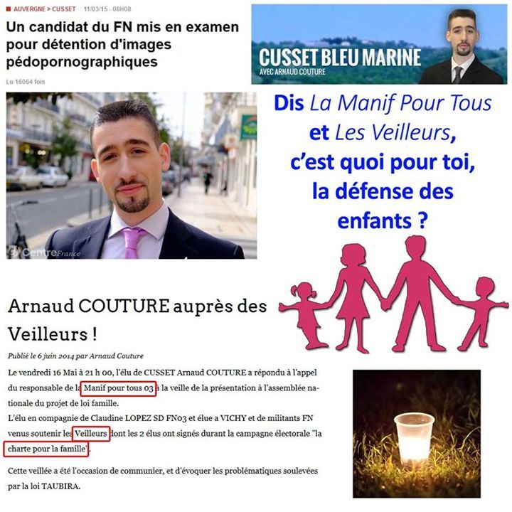Le candidat du Front National aux prochaines élections départementales dans l’Allier a été mis en examen le 6 mars 2015, selon une information confirmée par le parquet de Cusset. Arnaud Couture a été mis en examen pour « enregistrement, détention et diffusion d’images à caractère pédopornographique » et placé sous contrôle judiciaire. Le procureur n’a pas dévoilé d’autres informations contenues dans le dossier, l’instruction étant en cours.