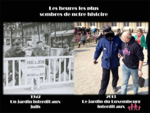 Il juxtaposait ainsi une photo montrant un parc pour enfants sous-titrée « 1942 un jardin interdit aux juifs » et une autre, montrant un homme portant un sweat-shirt à capuche de La Manif pour tous, tenu par le bras par un surveillant: « 2013 le jardin du Luxembourg interdit » aux militants de l’association.