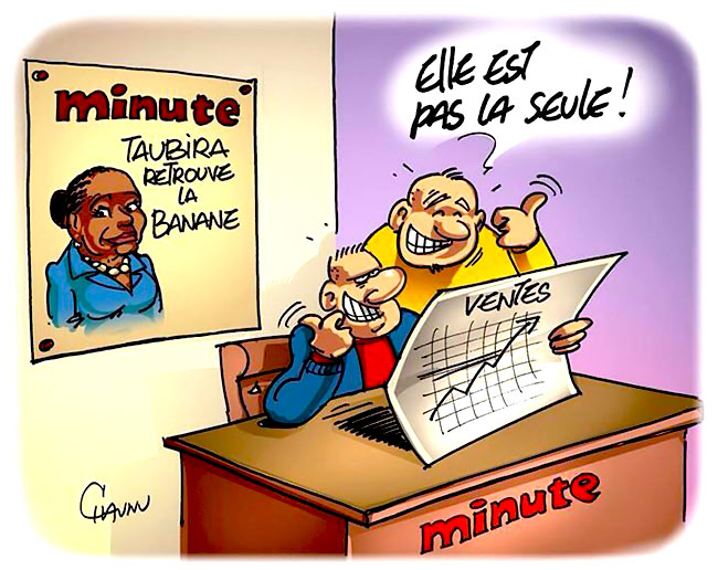 Dans son édition du 13 novembre 2013, le journal avait publié une photo de la garde des Sceaux, avec ce titre: « Maligne comme un singe, Taubira retrouve la banane ».