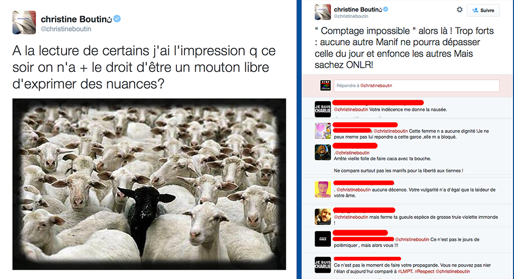 Christine Boutin qui revendique son droit d’être « un mouton libre d’exprimer des nuances », refuse de croire que les chiffres de la marche républicaine parisienne étaient supérieurs à la mobilisation contre le Mariage pour tous il y a deux ans… lorsque tous tente l’unité, Christine parle chiffres !