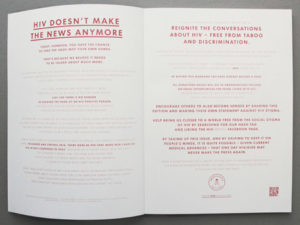« Being a lifestyle magazine, it was a challenge to express the seriosity of our cause and to keep the lifestyle and handwriting of our brand, » said the magazine’s editor Julian Wiehl. « We decided for a text-only cover and filed the most important letters HIV+ with the image of the cover from the standard edition as a reference. »