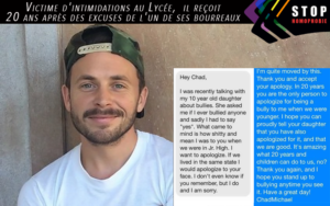 « Hey Chad, je discutais récemment avec ma petite fille de 10 ans sur le propos de l’intimidation. Et, elle m’a demandé si j’avais des fois également harcelé quelqu’un. J’ai dû lui avouer que c’était le cas. Et j’ai tout de suite pensé à toi et à toutes ces choses dégueulasses que j’avais pu te faire vivre lorsque nous étions au lycée. Je te demande pardon. Si nous étions dans la même ville, je t’aurais certainement présenter mes excuses en face. J’ignore si tu t’en souviens encore, ou si tu te rappelles même de moi, mais je suis sincèrement désolé de tout ce que je t’ai fait endurer. »