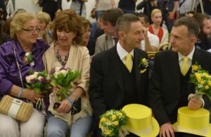 Arrivés en costume sombre, portant des cravates identiques, fleurs et chapeaux haut-de-forme jaunes vifs, les deux hommes ont écouté le court discours d’un jeune élu ému, puis confirmé leur identité et signé le registre, avant de poser pour les photos, sous les applaudissements.