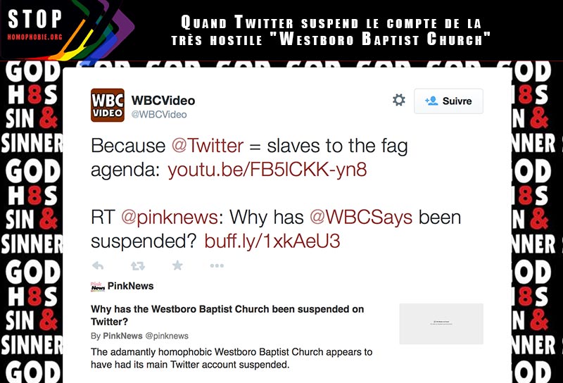 Aucune réaction du géant des médias sociaux aux requêtes de la « Westboro Baptist Church » toujours très active donc sur le réseau, ni d’ailleurs aux demandes de confirmation des allégations au site britannique « Pink News » qui a constaté « l’incident » jeudi dernier, ou encore au magazine américain « The Advocate« , si ce n’est une redirection vers les règles de violations : Twitter améliore son service de signalements d’abus et de harcèlement entre les utilisateurs !