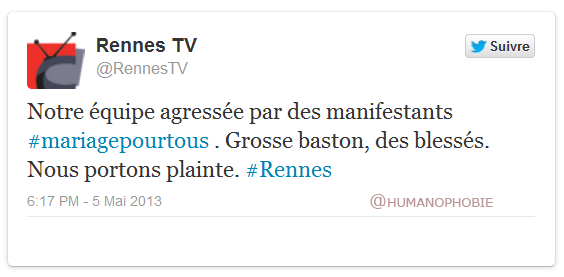 Un des journalistes du site internet RennesTV et son co-fondateur ont été agressés en marge d’une manifestation contre la « mariage pour tous » qui s’est tenue hier à Rennes. L’agression a eu lieu aux alentours de la place de la République alors que la foule commençait à se disperser. Les assaillants, identifiés par l’équipe de tournage comme des participants de la « Manif pour tous« , ont mis à terre l’un des deux journalistes avant de détruire la caméra que portait son collègue. RennesTV a porté plainte auprès de la police.