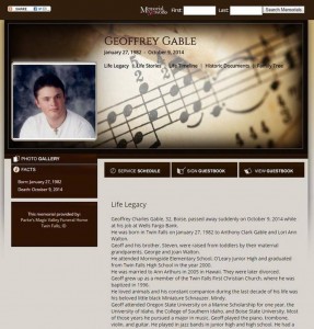 Geoffrey Charles Gable, 32, Boise, passed away suddenly on October 9, 2014 while at his job at Wells Fargo Bank.