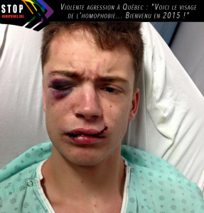 « Je n’ai aucun souvenir, j’ai perdu connaissance ! Le premier coup a été porté à ma figure, et 6 autres ont suivi … », a confié le jeune homme de 21 ans, qui n’a pas hésité à partager sa photo sur son compte, visage tuméfié, pour dénoncer et éviter que ce genre de situation ne se répète : « Voici le visage de l’homophobie… Je me suis fais attaqué parce que je suis gay ! Bienvenu en 2015 ! »